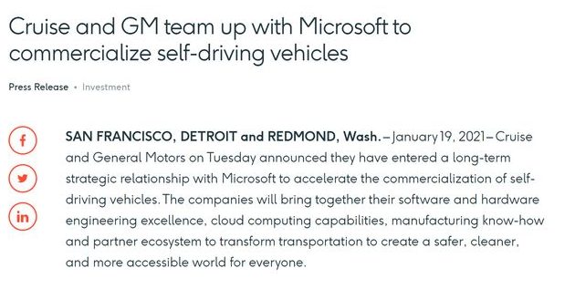 中國汽車新聞1月20日訊 昨日,通用汽車與Cruise聯(lián)合宣布,將與微軟建立長期戰(zhàn)略合作關系,加速自動駕駛汽車的商業(yè)化部署。此次合作將匯集三方在軟硬件、云計算、生產制造、合作伙伴生態(tài)等領域的強大實力,推動交通轉型,為每個人創(chuàng)造更安全、更環(huán)保、更便捷的未來出行。